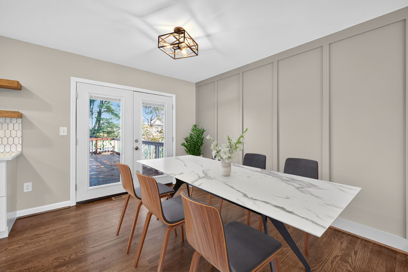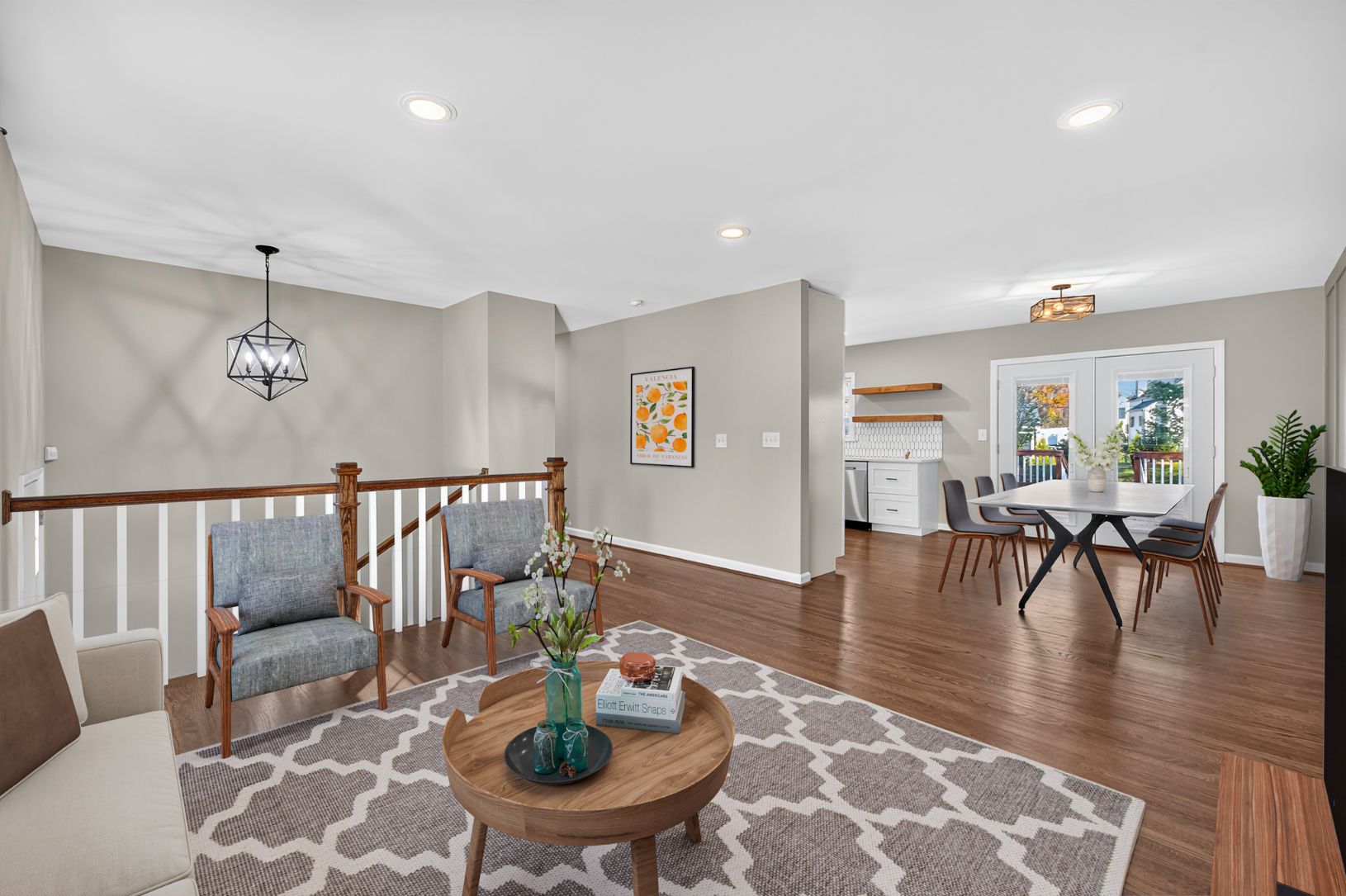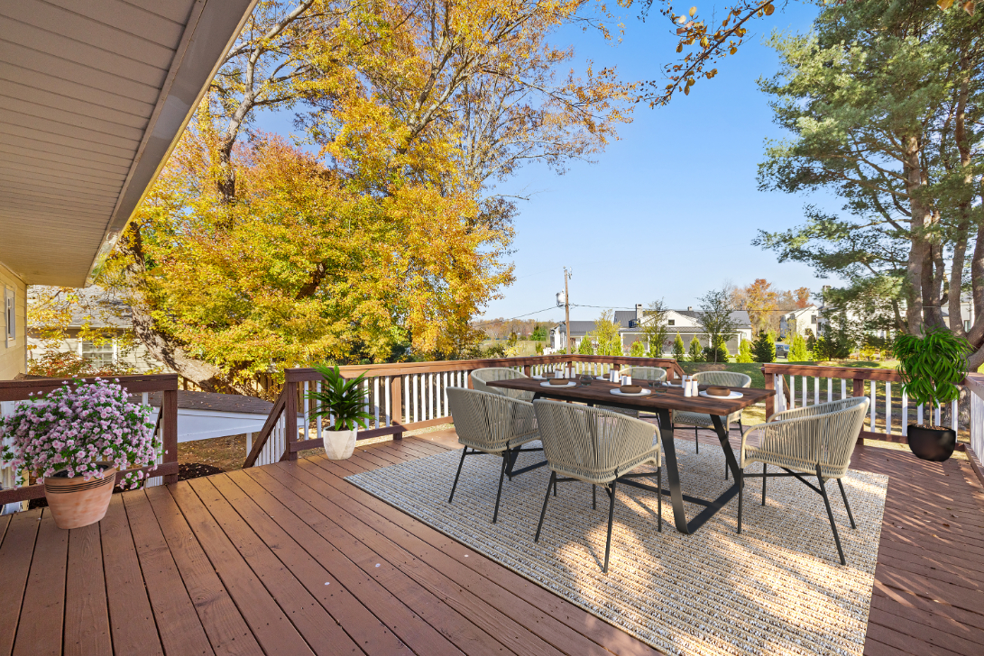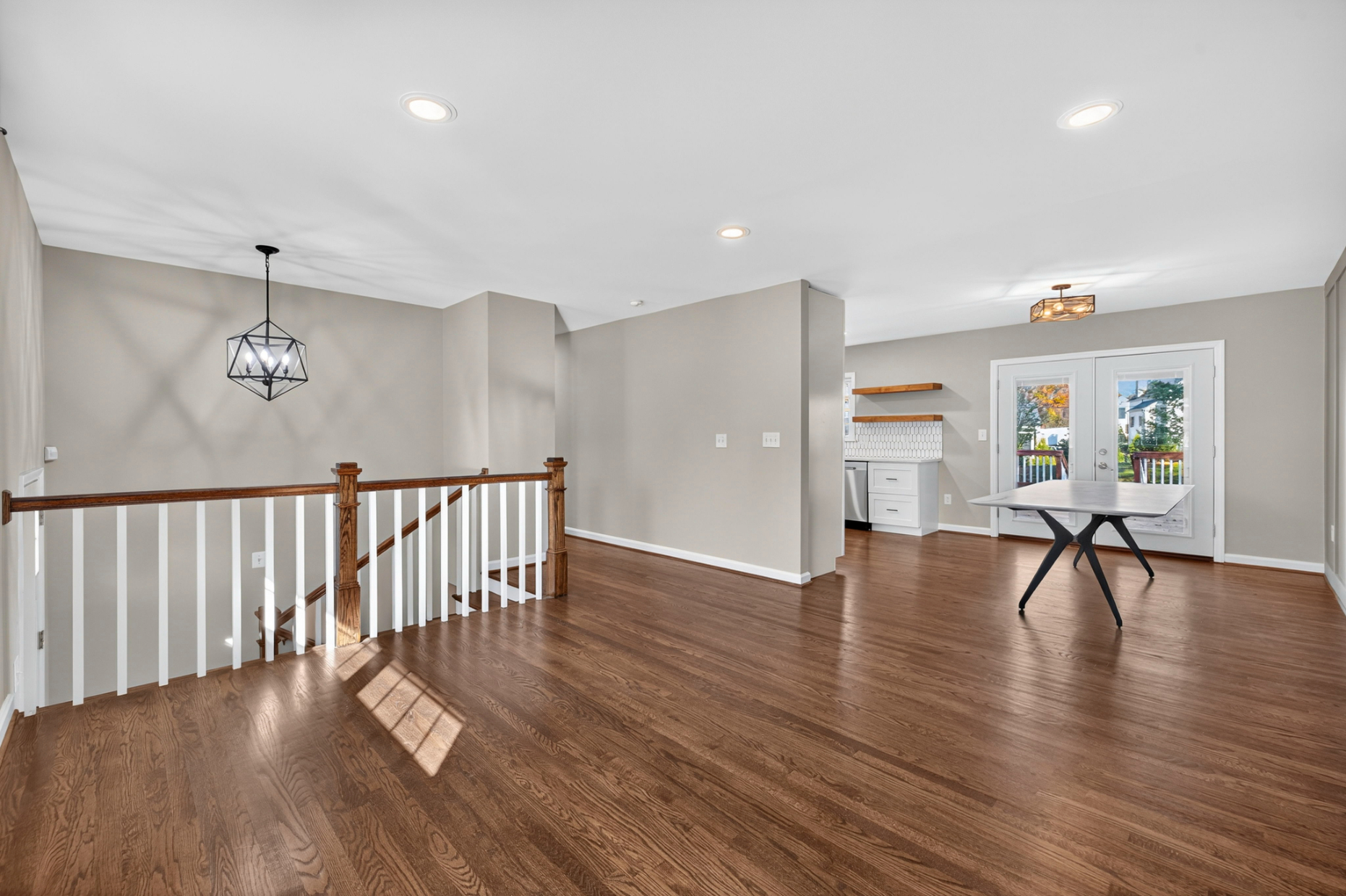 Renovated in 2021 the main level features a bright, open floorplan with beautiful hardwood floors and updated lighting throughout. The living room opens to the dining area and sunny kitchen with custom cabinets, stainless steel appliances, and quartz counters. Patio doors open onto a spacious, newly refurbished deck with stairs down to the backyard, perfect for entertaining friends and family. From the living area a hallway leads to the main bathroom, a cozy primary bedroom and two other bedrooms on this level.From the entrance foyer, stairs lead down to the fully finished lower level with laminate plank flooring and recessed lighting throughout. The flexible space offers a wet bar or efficiency kitchen, full bath, a fourth bedroom or office and utility room with washer and dryer. The spacious family room is filled with natural light and doors opening onto the covered patio and large fenced backyard.