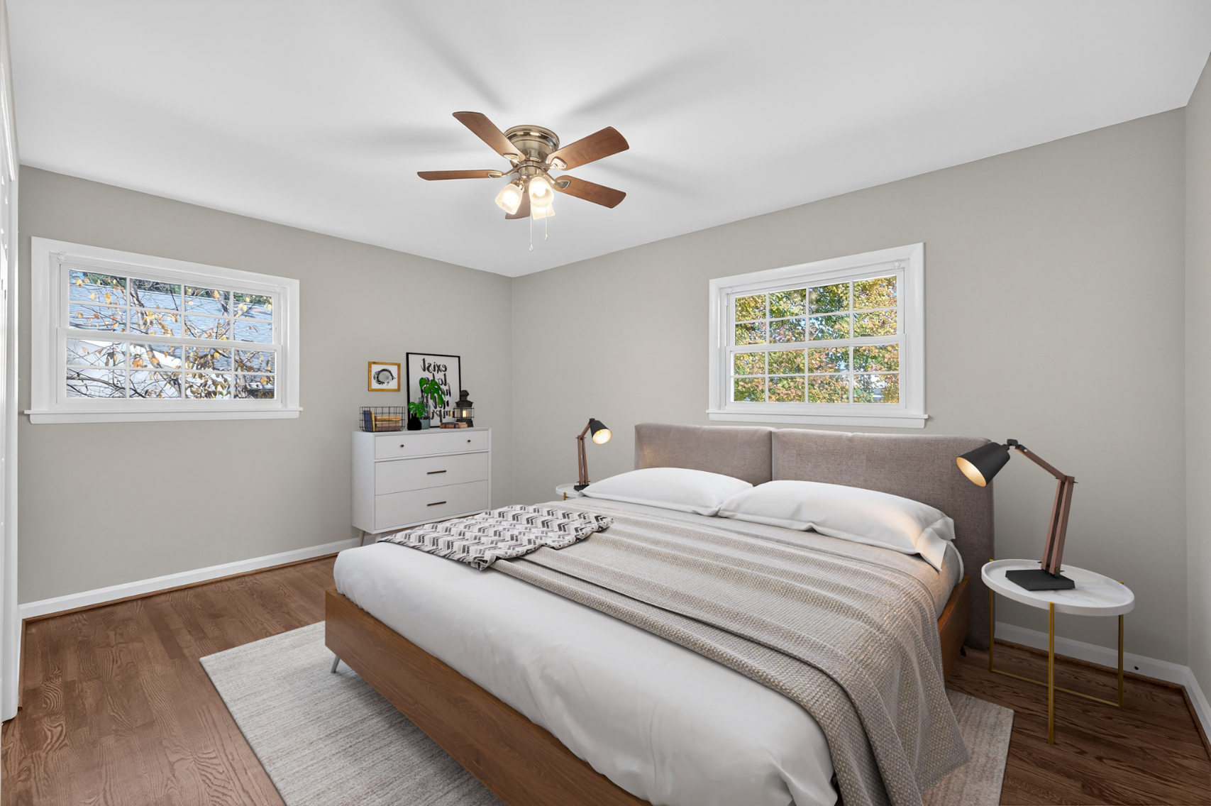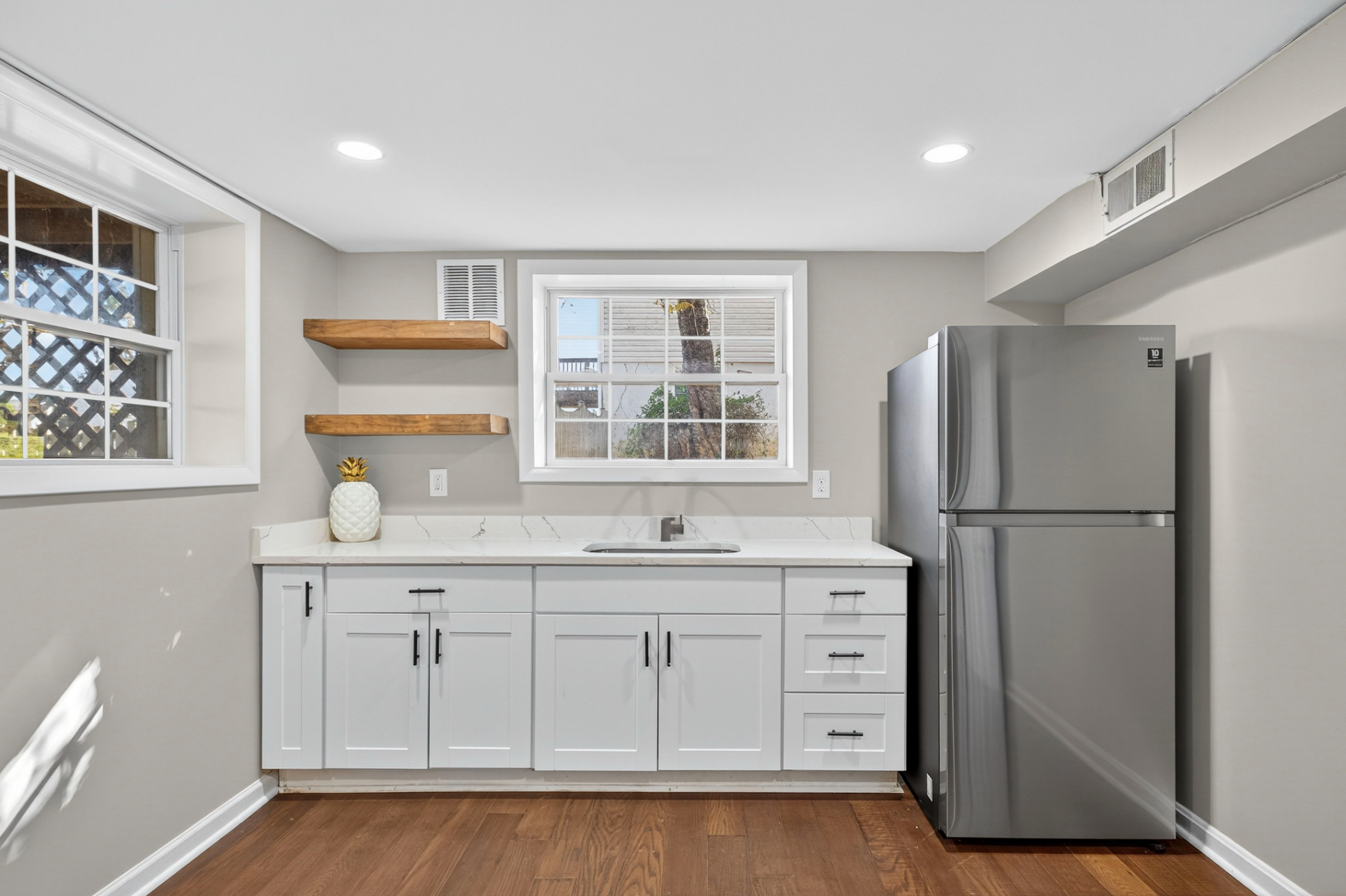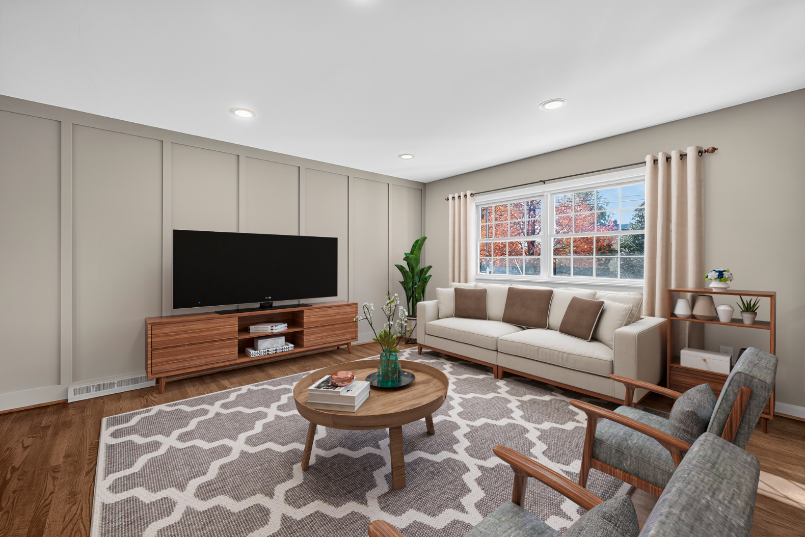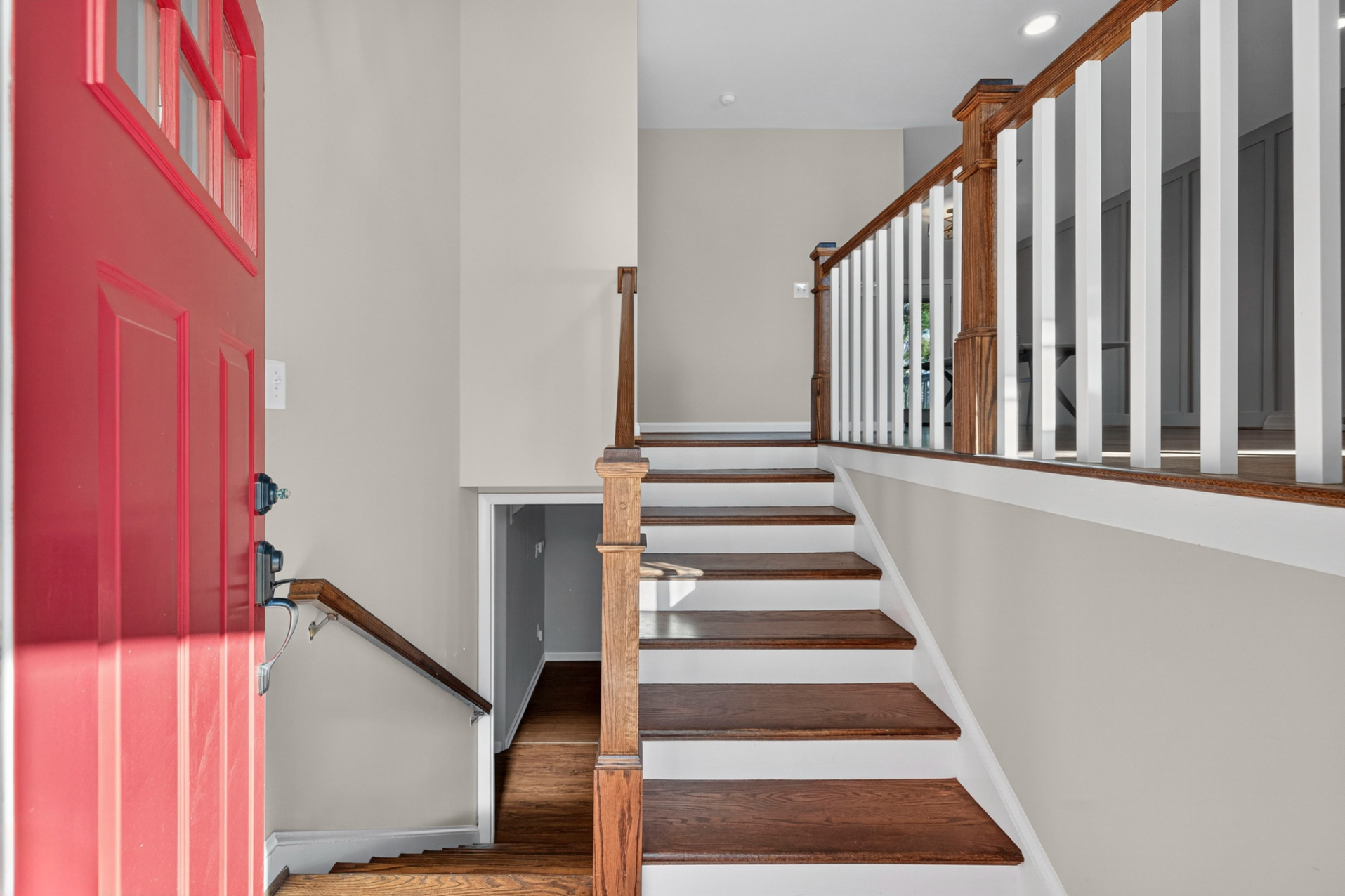 Renovated in 2021 the main level features a bright, open floorplan with beautiful hardwood floors and updated lighting throughout. The living room opens to the dining area and sunny kitchen with custom cabinets, stainless steel appliances, and quartz counters. Patio doors open onto a spacious, newly refurbished deck with stairs down to the backyard, perfect for entertaining friends and family. From the living area a hallway leads to the main bathroom, a cozy primary bedroom and two other bedrooms on this level.From the entrance foyer, stairs lead down to the fully finished lower level with laminate plank flooring and recessed lighting throughout. The flexible space offers a wet bar or efficiency kitchen, full bath, a fourth bedroom or office and utility room with washer and dryer. The spacious family room is filled with natural light and doors opening onto the covered patio and large fenced backyard.