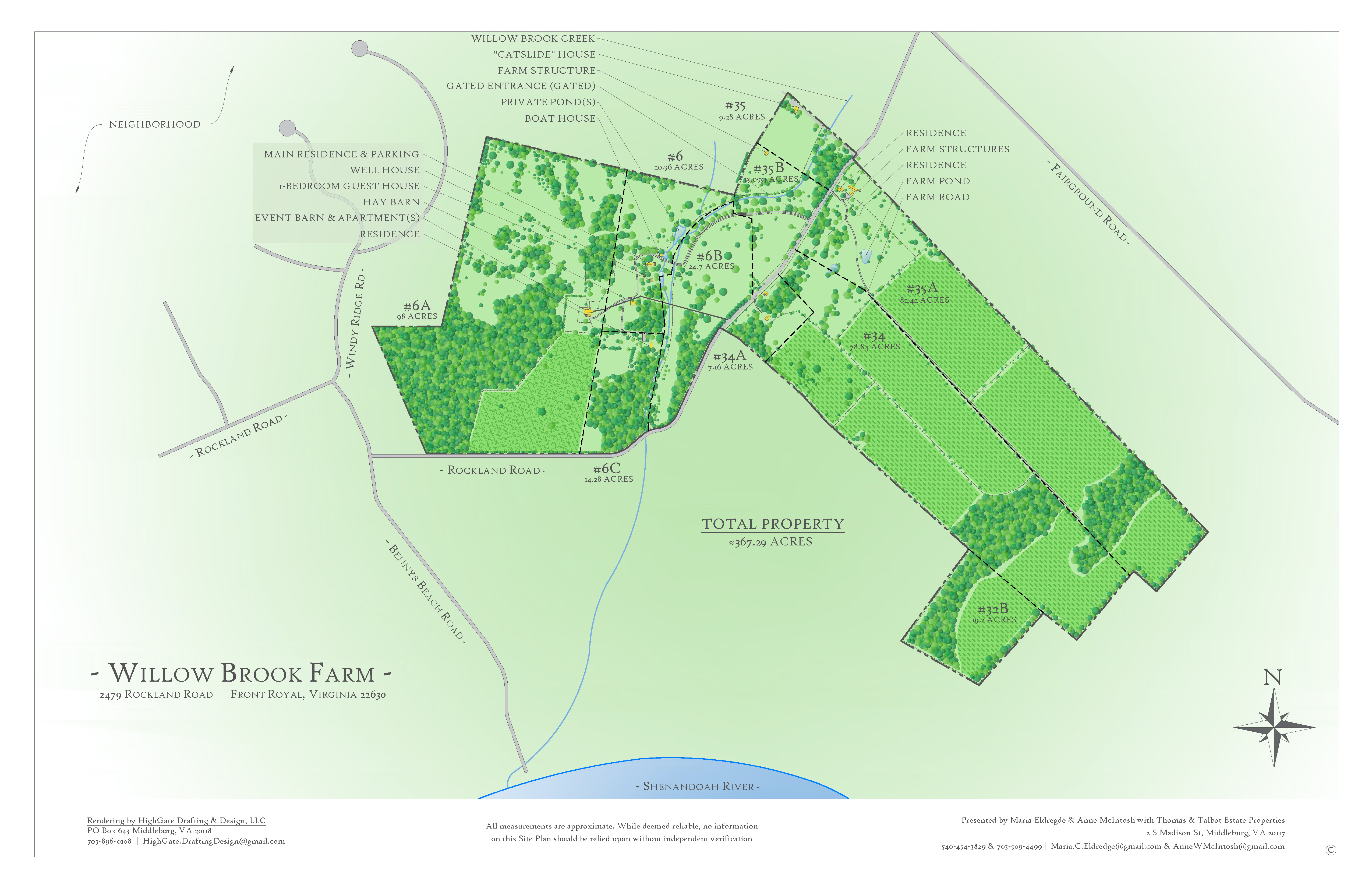 Deep in Virginia's famed horse country, Willow Brook has only been offered for sale four times in 245 years. c. 1780, this historic estate is 359 acres of serene farming country in the Rockland Rural Historic District. Just miles from Greenway Court, the first home of Lord Fairfax, built in 1752, Willow Brook offers timeless beauty and quiet sophistication. The main house is situated on a lovely creek "Willow Brook" and shares its banks with a charming working stone boat house. Inside this historic stone home, you find five bedrooms, three full baths and two half baths, a library, original English basement dining room and kitchen as well as a large sitting room for entertaining. The house has original hardwood floors throughout, beamed ceilings, and four fireplaces. The grounds have retained much of their original configuration. Within walking distance of the main residence, you will find a boat and spring house, one bedroom guest cottage with two fireplaces, and an authentic hand hewn log smokehouse. Extra facilities and dependencies include three additional houses on separate parcels. Willow Brook consists of 10 contiguous parcels on the east and west sides of Rockland Road. Additional structures include a large, beautiful barn for horses or other livestock and several sheds. The barn has an extensive workshop on the ground level and a fantastic second level finished with lovely post and beam accents for entertaining. Views from the barn of the Blue Ridge Mountains are breathtaking. The entire property is being sold AS IS. It is all in VOF conservation easement. Upon visiting the property, we can share individual plats and specific future building options available within the easement. Willow Brook would make the perfect family compound. The property is 1 hour from Dulles Airport, local shopping in Front Royal, Berryville, Winchester, and Millwood. Livestock on property, do not enter without a listing agent.